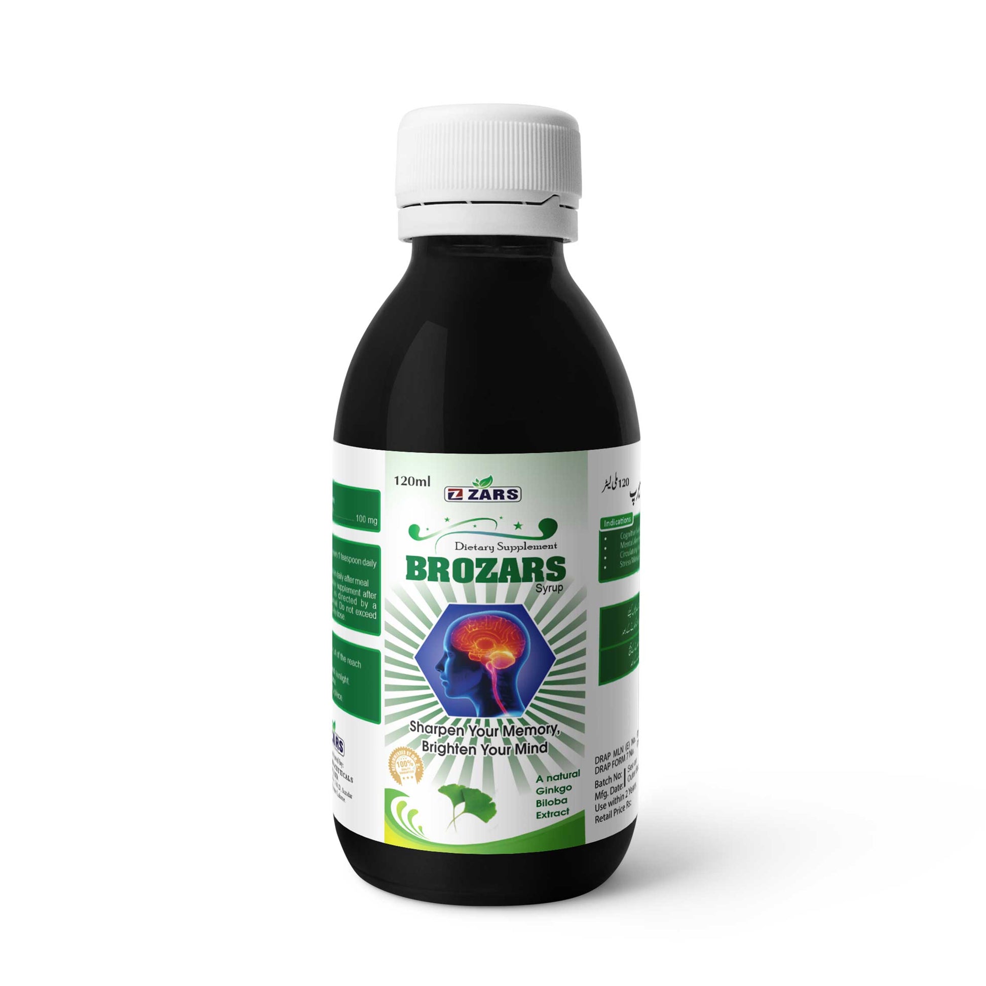 BROZARS is a specialized memory and cognitive support syrup formulated with Ginkgo Biloba Extract (100 mg per 10 ml). Ginkgo is well-researched for its ability to support healthy blood circulation to the brain, improve mental clarity, and enhance memory and focus.