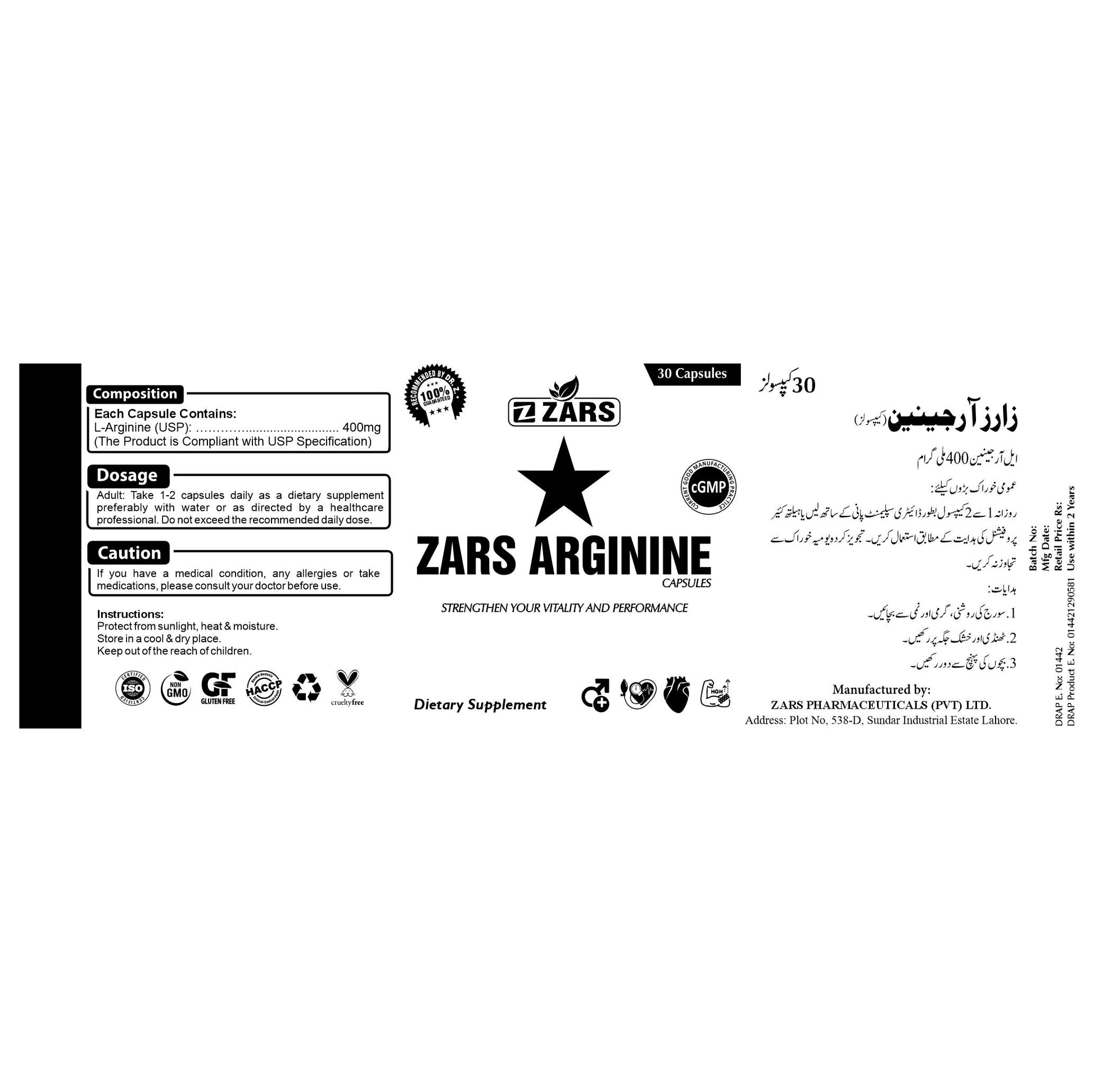 Support your circulation, performance, and heart health with ZARS ARGININE—our high-quality L-Arginine supplement. Each capsule delivers 400mg of L-Arginine (USP), fully compliant with United States Pharmacopeia (USP) specifications to ensure purity, potency, and safety.